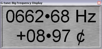 G-tune is essentially a frequency meter, and can be used to accurately measure the main frequency in any input signal. The measured frequency is displayed with a resolution of 0.01Hz. An the cents deviation from the nearest semitone is also shown with a resolution of 0.01cents. Note that the actual accuracy will depend on the sound card used. See G-tune performance for more information.