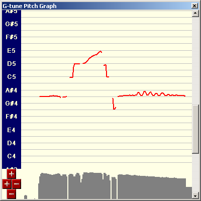 The pitch graph window displays the notes on the vertical axis and time on the horizontal axis. The current note is plotted as a red line, and is continually updated, scrolling as required. The bottom of the window indicates of the amplitude. The window can be resized, and zoomed in all directions using the “+” and “-“ buttons.